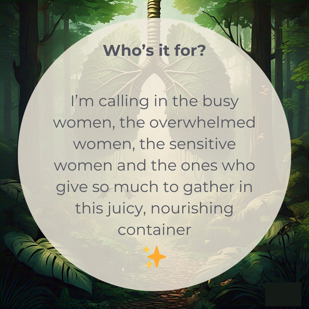I’m calling in the busy women, the overwhelmed women, the sensitive women and the ones who give so much to gather in this juicy, nourishing container— to come back to themselves and find ease, growth, and support.